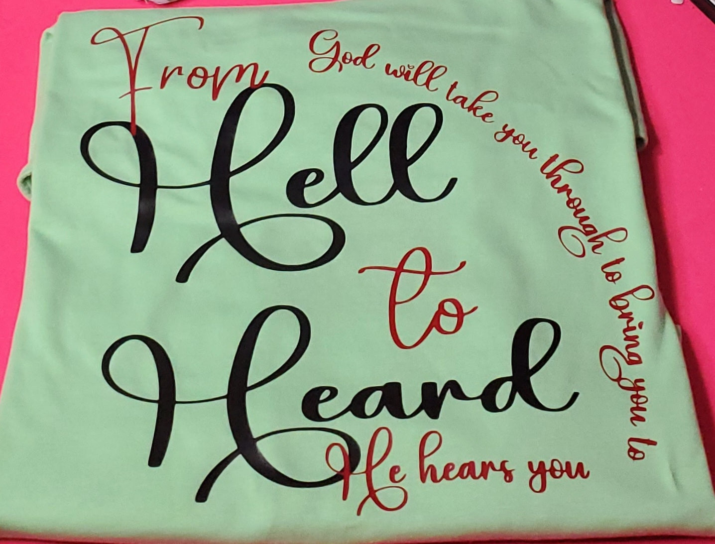 This vibrant kiwi-colored t-shirt, inspired by the powerful message "From Hell to Heard," serves as a bold testament of faith and perseverance. It reminds wearers that God guides you through trials to lead you exactly where you are meant to be. Crafted for those who value meaningful inspiration in their wardrobe, this shirt combines comfort with a message of hope and strength. Perfect for daily wear or as a statement piece, it encourages resilience and spiritual growth in every situation.